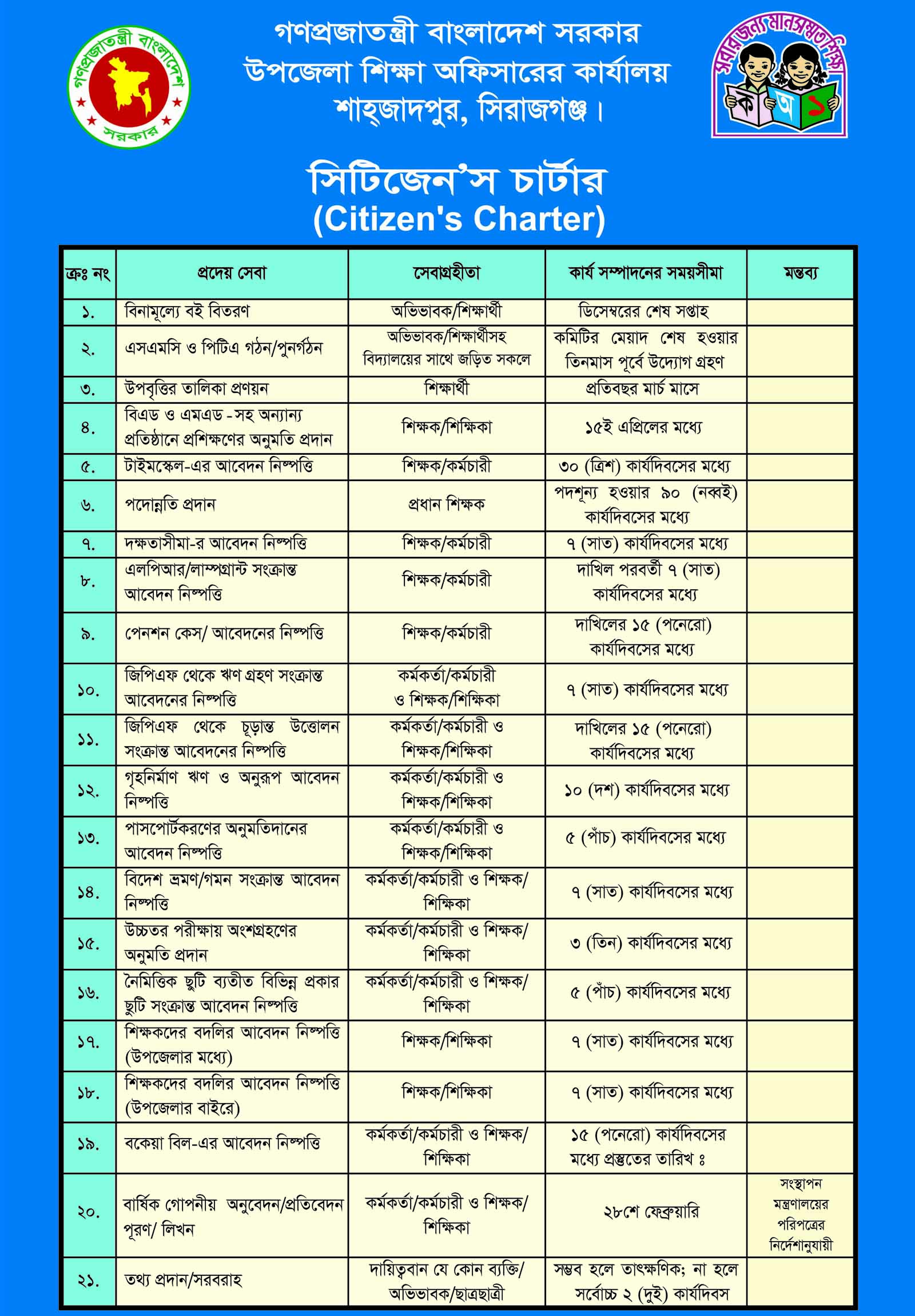| ক্রমিক নং | প্রদেয় সেবা | সেবাগ্রহীতা | সেবাপ্রাপ্তির জন্য করণীয় | সেবা প্রদানকারীর করণীয় | কার্য সম্পাদনের সময়সীমা | মন্তব্য |